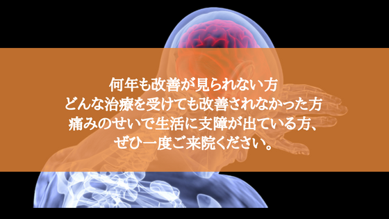 何年も改善が見られない方、どんな治療を受けても改善されなかった方、痛みのせいで生活に支障が出ている方、ぜひ一度ご来院ください。